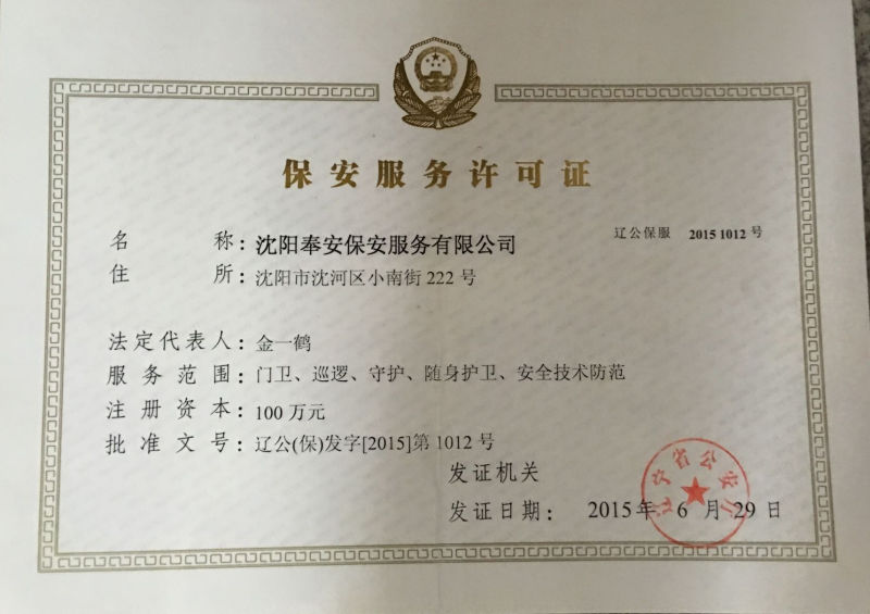 沈陽奉安保安服務(wù)有限公司(原沈陽市沈河區(qū)保安服務(wù)公司)創(chuàng)建于一九八八年八月,是遼寧省公安廳、沈陽市公安局批準,工商行政部門登記注冊,全市首家具備保安資質(zhì)的特殊性服務(wù)企業(yè),隸屬于沈陽市沈河區(qū)政府直管的全民國有企業(yè),現(xiàn)為中國保安協(xié)會會員單位和省保協(xié)、市保協(xié)常務(wù)理事單位:在全市同行業(yè)中率先通過ISO國際質(zhì)量認證,是市工商局批準的“重合同守信用”免檢單位和沈陽市政府采購中心保安服務(wù)項目重點競標單位;擁有一支專業(yè)化、標準化、職業(yè)化的高素質(zhì)保安隊伍,是公安機關(guān)重要的輔警力量。